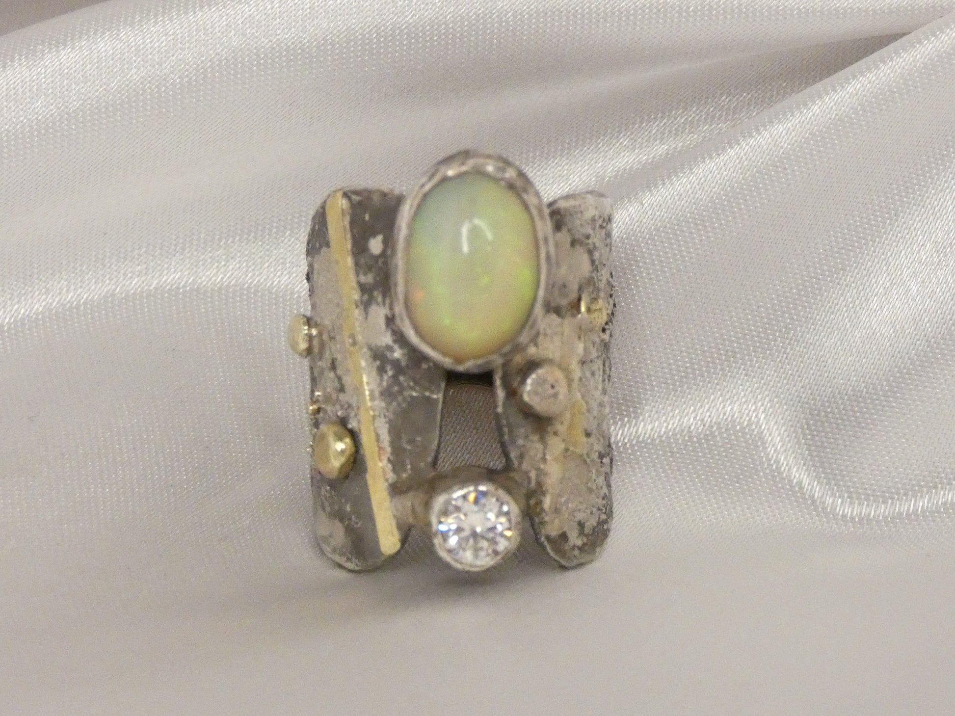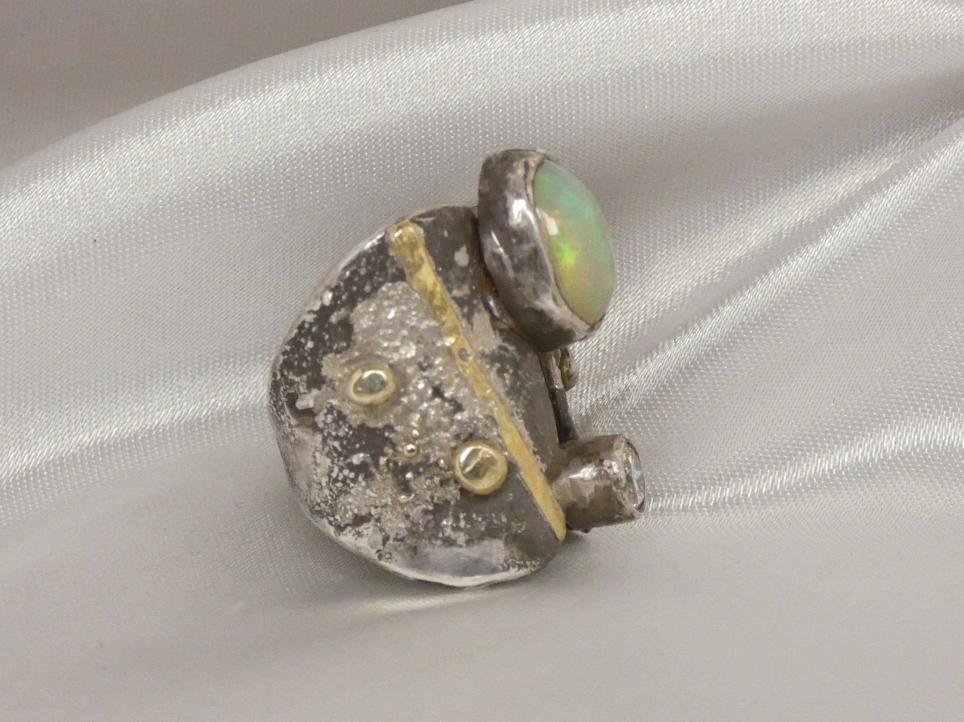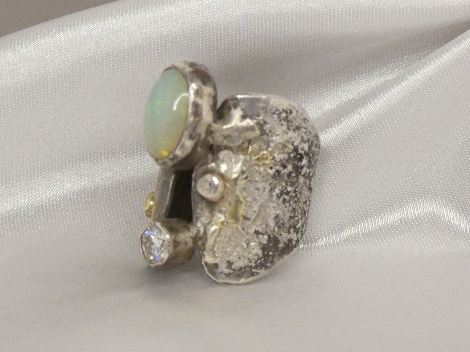 Bague argent Moissanite et Opale en argent massif, telle une sculpture artisanale, avec une opale aux reflets célestes et une moissanite éblouissante.