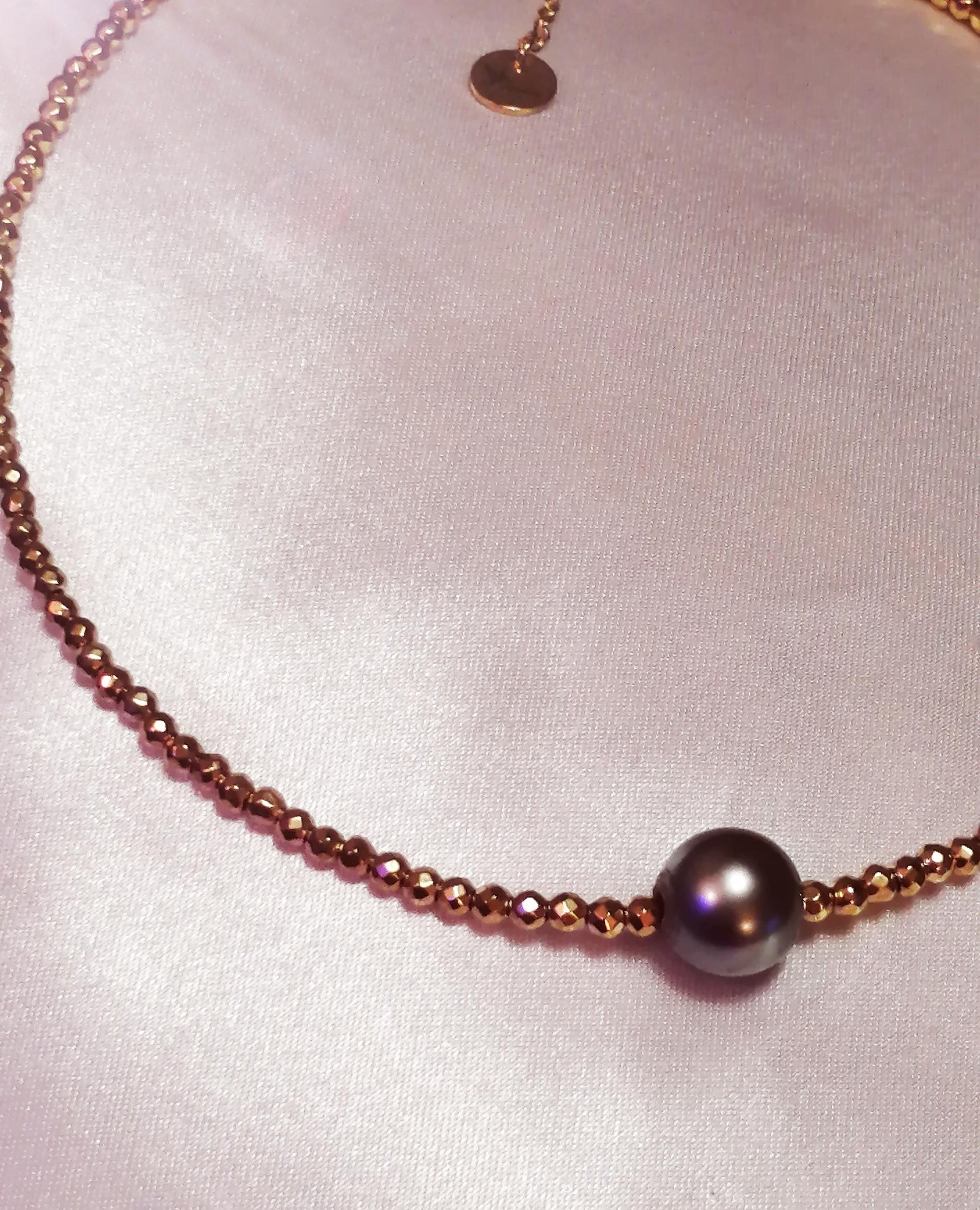 Collier ras-de-cou en perles d' hématite doré et Perle de culture de Tahiti